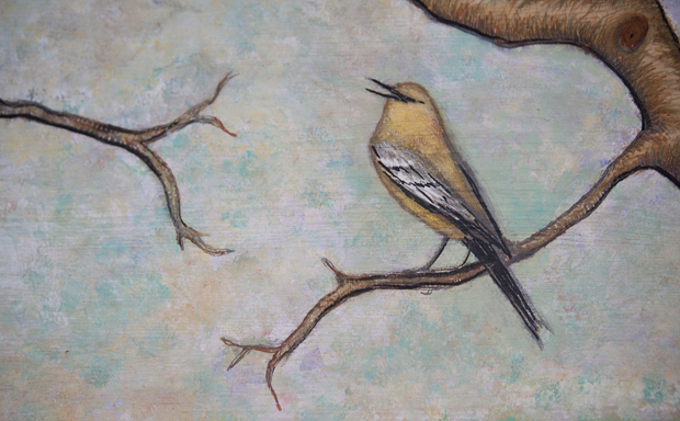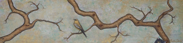 Laura Daniel " Single Observer " Pyrography and Mixed Media 11.5" X 48" $375